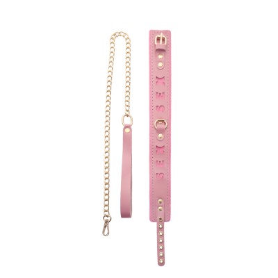 Ошейник розовый с поводком с надписью SEX (фетр, золото)