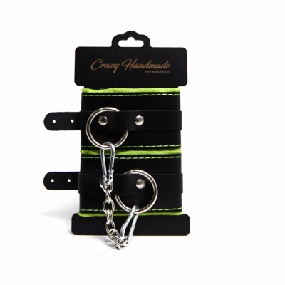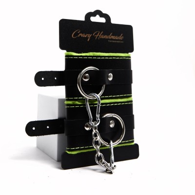 Наручники выполнены из высококачественной натуральной кожи черного цвета. Внутренняя сторона сделана из приятного на ощупь зеленого фетра, который обеспечивает мягкость и комфорт. Надежная стальная фурнитура с серебристым покрытием добавляет конструкции прочности и элегантности. В комплект входит прочный соединительный карабин, делая этот аксессуар универсальным для различных ситуаций.