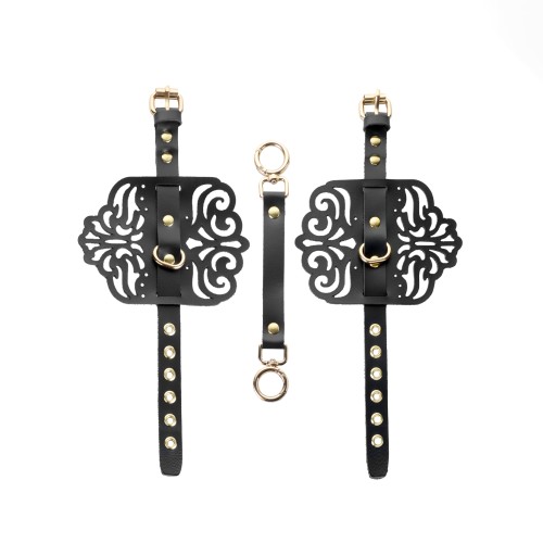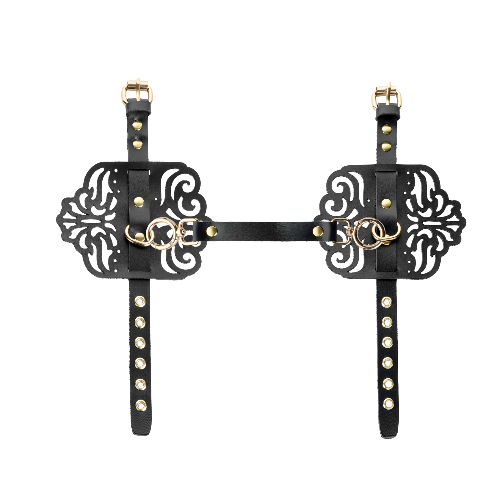 Оковы фигурные из натуральной кожи, украшенные узорами. Каждый элемент дизайна тщательно проработан, чтобы подчеркнуть красоту и элегантность изделия. Золотая фурнитура, сверкающая на фоне черной кожи, добавляет утонченности и изысканности.